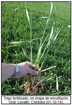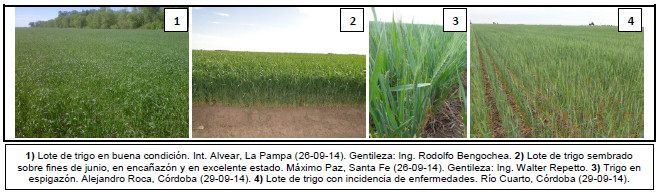 El actual panorama general del cultivo, junto con el incremento de área registrado durante el presente ciclo (+13,3 % vs. campaña 13/14), permiten mantener las buenas perspectivas para la campaña, siempre y cuando las condiciones ambientales se mantengan estables. En los núcleos trigueros del Sudeste y Sudoeste de Buenos Aires, gran parte del área aún transita etapas de macollaje, mientras que un 30 % de la superficie se encuentra encañando con muy buena oferta hídrica. La condición sanitaria en general es buena en ambas regiones, pero sectores que se recuperan de los excesos hídricos comienzan a reflejar una mayor presión de enfermedades foliares, que deberán ser tratadas para no afectar aún más el rendimiento a cosecha.