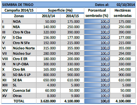 A pesar de las malas condiciones registradas sobre las provincias del norte, la franja central del país ha mejorado la oferta hídrica en gran parte de la región. En paralelo, el sector sur del área agrícola nacional, en donde se ubican los núcleos trigueros más importantes del país, ha mantenido o mejorado el estado de los cuadros. Esto último gracias a una paulatina normalización de la condición hídrica, principalmente sobre gran parte de las regiones afectadas por excesivas lluvias durante otoño e invierno (centro, este y sudeste de Buenos Aires).