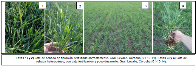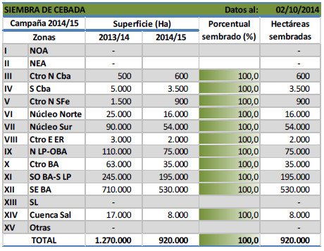 Luego de la última semana, en la cual se registraron precipitaciones sobre el margen este del área agrícola nacional y una franja del sur de Córdoba, los cuadros de cebada mantienen las buenas condiciones que venían presentando. La excepción a esto son aquellos lotes que fueron afectados por excesos hídricos, principalmente en el sudeste, centro y este de Buenos Aires. Recordamos que estas regiones afectadas concentran alrededor del 60 % del área cebadera nacional, estimada para esta campaña en ; si bien las pérdidas no son 920.000 hectáreas generalizadas, se deberá seguir de cerca la evolución de estos lotes.