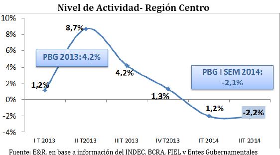 Al Segundo Trimestre de 2014, las distintas regiones geográficas del país presentaron una caída en el nivel de actividad promedio del 2,3%. Las regiones Pampeana, Cuyo y Centro habrían sido las de mayor caída, con tasas de contracción interanuales del 2,8%, 2,3% y 2,2%, respectivamente, seguidas de las regiones Patagónica y NEA, con caídas del 1,5% y 0,7%, respectivamente, mientras la región del NOA habría experimentado la menor contracción (-0,4%).