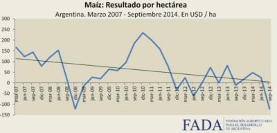 Con respecto a septiembre de 2013, cuando el índice FADA fue de 75,4%, el precio FOB de la soja cayó un 21,6%, el del maíz un 26,6% y el del trigo un 8,6%, todos medidos en dólares. Esto genera que el valor bruto ponderado de producción de una hectárea promedio del país haya caído un 20,7% en dólares. Esta caída de precios genera que el girasol, el trigo y el maíz entren en terrenos de rentabilidades negativas, quedando la soja como único cultivo rentable y presionando aún más sobre la sustentabilidad del sistema productivo agrícola.