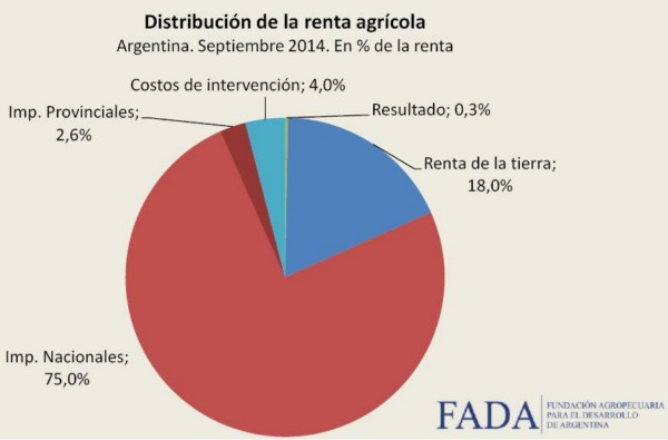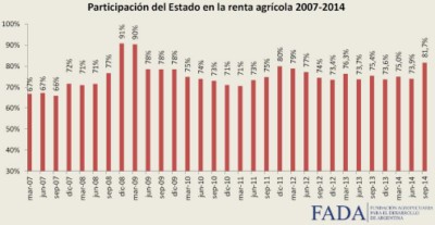 La última medición publicada, correspondiente a junio de 2014, informaba que el Estado se quedaba con $73,90 de cada $100 de renta que generaba una hectárea promedio de Argentina. Esto se realiza tomando distancias al puerto, rindes y costos medios a nivel nacional y la ponderación de los cuatro principales cultivos del país: soja, maíz, trigo y girasol. Esta fórmula arroja un incremento de la participación del Estado sobre la renta agrícola hasta alcanzar el 81,7% para el mes de septiembre.