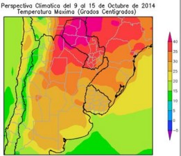 La mayor parte del Paraguay, el este de Salta, la mayor parte de Santiago del Estero, la mayor parte de la Región del Chaco, de Santa Fe, el oeste de Corrientes, el noroeste de Entre Ríos, registrarán temperaturas máximas superiores a 35°C, con un foco cálido con temperaturas superiores a 35ºC, con focos de más de 40°C. El sudeste del Paraguay, el este del NOA, la mayor parte de la Mesopotamia, el centro de Cuyo, el norte de Córdoba, el centro de Santa Fe y el oeste del Uruguay, observarán temperaturas máximas entre 30 y 35ºC.