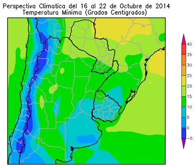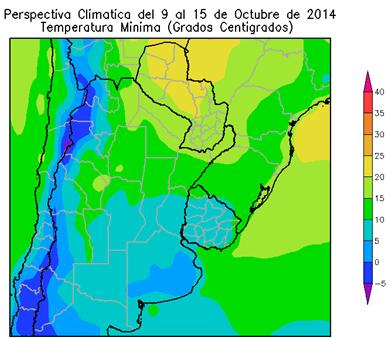 El este del NOA, la mayor parte de Cuyo, la mayor parte de la Región del Chaco, la mayor parte de la Mesopotamia, el oeste de la Región Pampeana y el noroeste y el sudeste del Uruguay, observarán temperaturas mínimas entre 10 y 15ºC. El centro-este del NOA; el centro de Cuyo, el este de la Región Pampeana y la mayor parte del Uruguay observarán temperaturas mínimas entre 5 y 10 ºC con leve riesgo de heladas localizadas.
