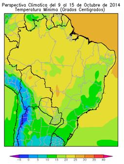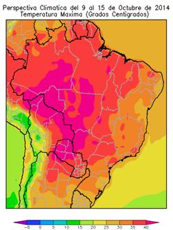La mayor parte del oeste y el centro del área agrícola brasileña, observará temperaturas máximas superiores a 35ºC. Con varios focos con temperaturas superiores a 40ºC. La mayor parte de los Estados de Bahía, Mina Gerais, Paraná, Santa Catarina, Río Grande do Sul, el este de Sao Paulo y el este de Goias, observarán temperaturas máximas entre 30 a 35ºC.
