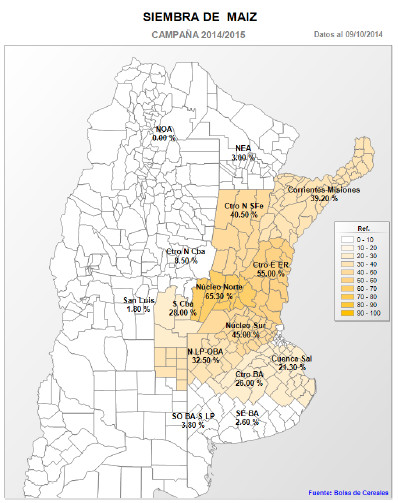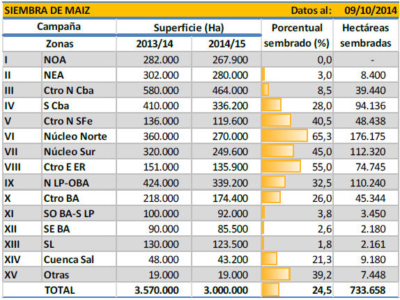 Habiendo tomado un gran impulso en los últimos siete días, favorecido por la reposición de humedad en el perfil, avanza la siembra de maíz con destino grano comercial. A la fecha llevamos se sembró un 24,5% de un área tentativamente proyectada en , registrando un progreso intersemanal e interanual de 12,1 y 10,9 3.000.000 hectáreas puntos porcentuales respectivamente. En números absolutos ya se cubrieron 733 mil hectáreas a nivel nacional. Las precipitaciones caídas durante la pasada semana en gran parte del área agrícola nacional, recompusieron la humedad del perfil. Esto permitió avanzar con las tareas de cobertura de manera fluida en zonas en donde el agua útil disponible en los primeros centímetros del suelo escaseaba. En consecuencia, se registraron grandes progresos en zonas como el Sur de Córdoba, Centro-Este de Entre Ríos, Núcleo Norte-Sur y el Norte de La Pampa-Oeste de Buenos Aires.