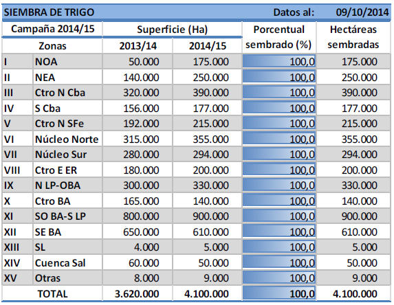 Sobre el Centro-Norte de Santa Fe la mayor parte del área sembrada fue pulverizada contra enfermedades de hoja, principalmente mancha amarilla y roya anaranjada. En esta región el cultivo transita etapas de llenado de granos, a pesar de que hay siembras tardías que aún se encuentran espigando o floreciendo. La oferta hídrica es heterogénea, varía según la zona, pero los cuadros se mantienen en buenas condiciones. Hacia el sur, sobre la región Núcleo Norte la oferta hídrica es homogénea y permite sostener el muy buen estado de los cuadros. La mayor parte del área se encuentran espigando y ya se realizaron aplicaciones de fungicidas para controlar enfermedades de hojas (mancha y roya principalmente).