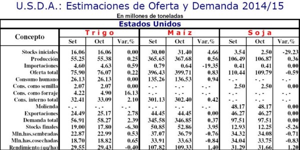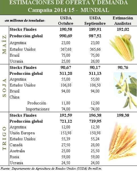 El USDA bajó su estimación de inventarios finales de trigo en el mundo para 2014/15 a 192,6 millones de toneladas, pese a cosechas algo más voluminosas en la Unión Europea, Pakistán y Ucrania. Una mayor demanda en los países importadores dejaría un remanente menor al previsto.