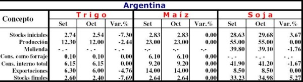 Para la Argentina se prevé una producción de trigo a 12 millones de toneladas, por debajo de los 12,30 millones proyectados el mes pasado. El saldo exportable fue reducido de 6,30 a 6 millones.