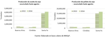 La producción nacional de aceite y pellets de soja aumentó un 8,5% en el acumulado de los primeros ocho meses del año en relación a igual período de 2013. En la provincia de Córdoba, la producción de aceite y de pellets subió un 21% y un 32% respectivamente. En Buenos Aires la producción exhibió un retroceso en aceite (9,5% o 33.139 toneladas) y en pellet (5% o 67.000 toneladas). En el caso de Santa Fe existió un gran incremento en el volumen producido tanto para aceite (327.655 toneladas) como para pellet (1.487.534 toneladas), es decir un incremento de 8,6% y 9,7% respectivamente. La participación de Córdoba en la molienda de soja a nivel nacional se situó en 5,9% (1.423.736 toneladas), mientras que Santa Fe representó el 86.5% del total producido.