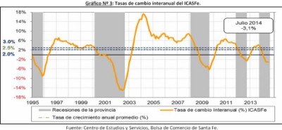 En julio de 2014 la actividad económica de la provincia de Santa Fe se contrajo un 0,3%. Aunque el ICASFe se ubica levemente por encima del piso alcanzado en septiembre de 2012, la recesión actual ya lleva diez meses y persiste el escenario de estancamiento económico iniciado a fines de 2011.