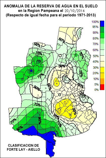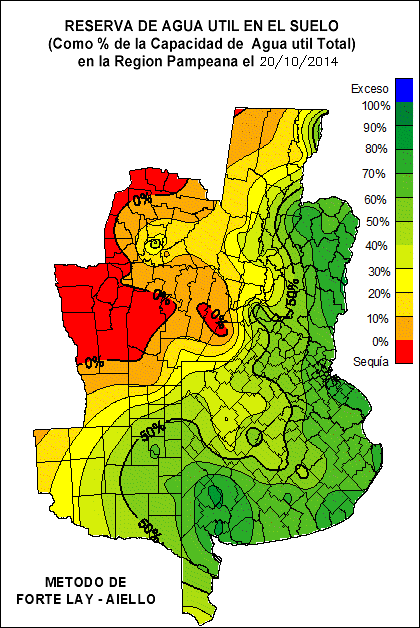 RESERVA DE AGUA ÚTIL EN EL SUELO (como % de la capacidad de agua útil total) en la Región Pampeana el 20 de Octubre de 2014