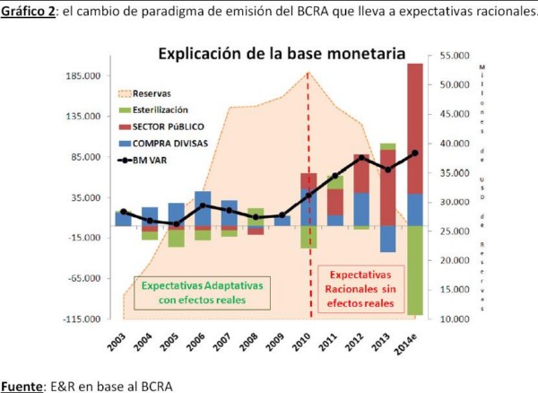 El cambio de paradigma de emisión monetaria del 2011 / 2012 más la creación del cepo conducen al público hacia un proceso de aprendizaje que lo lleva a formar sus expectativas de inflación en forma racional. Es decir, a la hora de prever la inflación (devaluación) futura, los agentes económicos empiezan a tener en cuenta el déficit fiscal, la emisión monetaria, la cantidad de pesos, las reservas del BCRA y los flujos de oferta y demanda de dólares.