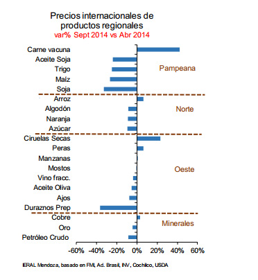 En la Editorial de Jorge Day para Fundación Mediterránea- Instituto de Estudios sobre la Realidad Argentina y Latinoamericana (IERAL), se destaca que desde abril de este año, la caída de precios internacionales ha sido más intensa en productos típicos de la región pampeana, y menos marcada para el resto.