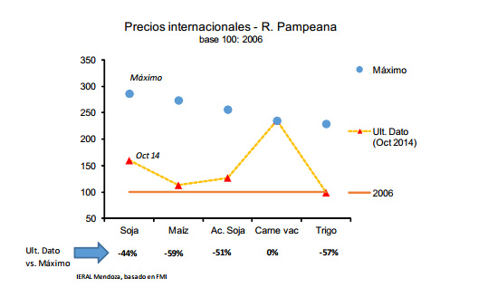 Región pampeana (con datos de octubre de 2014): consideremos el caso de la soja. Partiendo del año 2006, su precio casi se triplicó (año 2008), y con respecto a ese máximo, actualmente el precio está un 44% por debajo.