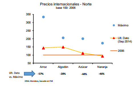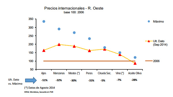 Oeste argentino: algunos tuvieron mayores máximos (ajo, frutas, mostos), y han caído, pero están por encima de los valores iniciales. En otros, poco aumentaron luego de 2006 (vinos y aceite de oliva), y en el último caso, su precio está por debajo del punto de partida