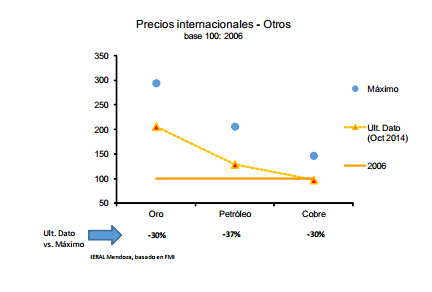 Minerales y combustibles (con datos a octubre): el oro tuvo un fuerte aumento, y luego ha caído pero se halla por encima del año 2006, algo que no ocurre con el cobre.