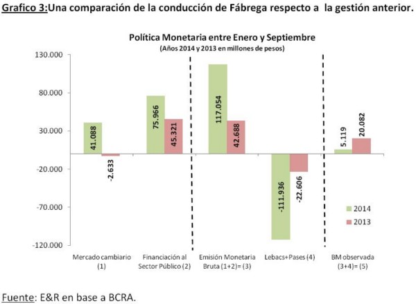 Fábrega pareció haber entendido los efectos negativos y los riesgos de la caída de la demanda dinero y por eso la “corre de atrás”, colocando una cantidad de LEBACs y pases ($111.936 MM) casi equivalente al aumento de la emisión bruta ($117.054 MM) en los primeros 9 meses de 2014.
