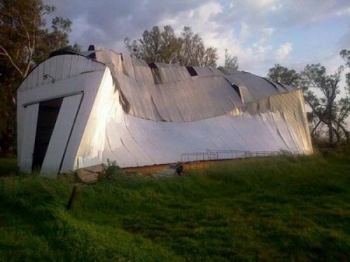Producto del fuerte viento registrado, se produjo la voladura de un galpón en la localidad de Emilio Ayarza. Personal de Defensa Civil de la ciudad de Chivilcoy trabajó en el lugar.