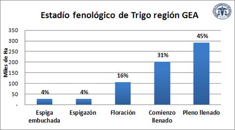 La ola de calor, que mantuvo máximas de 35° C en toda la semana, tendría efectos adversos sobre el trigo, que está atravesando etapas claves. El 31% de los cuadros trigueros comienza a llenar grano y el 45% se encuentra en pleno llenado. Las altas temperaturas aceleraron el desarrollo del cultivo y bajaría el nivel de rindes sobre todo en los lotes más castigados por la falta de agua. Esto es en el oeste de la región núcleo, en los departamentos cordobeses de Unión y Marcos Juárez. Como ejemplo, en la localidad de Los Surgentes prevén caídas de rindes de hasta en un 20% en los lotes más castigados por las condiciones desecantes. En la región siguen persistiendo las enfermedades foliares como roya y mancha amarilla.