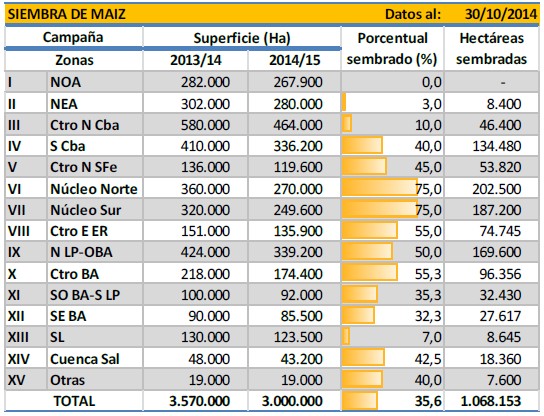 Las lluvias registradas a comienzos de esta semana sobre la provincia de Buenos Aires y La Pampa, nuevamente causan demoras en las labores de siembra de maíz con destino grano comercial. A la fecha se lleva cubierto tan sólo el 35,6 % de una superficie tentativamente proyectada en para la campaña en 3.000.000 hectáreas curso. De esta manera, el avance intersemanal es de 2,8 puntos porcentuales y el progreso interanual es de 0,8 puntos. En números absolutos se han sembrado más de 1 millón de hectáreas.