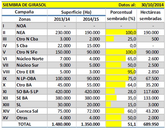 Por otra parte, abundantes lluvias acumuladas durante los días previos a este informe, sobre importantes áreas de Buenos Aires, podrían afectar la incorporación de cuadros en los otros dos núcleos girasoleros de nuestro país, el sudeste y sudoeste bonaerense. Al mismo tiempo, el centro y el este de esta misma provincia también acumulaban importantes milimetrajes, con lo cual habrá que esperar algunos días más para evaluar el impacto de estas lluvias sobre el estado de cuadros destinados inicialmente a este cultivo.