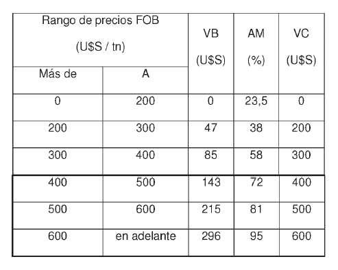 Art. 4º — Los valores expresados en la fórmula definida en el Artículo 1º de la presente resolución, aplicables a las mercaderías comprendidas en la posición arancelaria referenciada con la letra E (Poroto de Soja) en la planilla que, como Anexo, forma parte integrante de la presente resolución, surgirán de la tabla que se consigna a continuación, para cada rango de precios FOB oficiales: