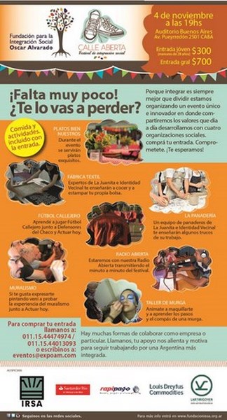 ¡Falta muy poco! ¿Te lo vas a perder? El próximo martes 4 de noviembre, la Fundación para la Integración Social Oscar Alvarado llevara a cabo el Festival de Integración Social en el Auditorio Buenos Aires en Av. Pueyrredón 2501, CABA. La entrada tiene un costo de $300 para los menores de 28 años y la general está $700.