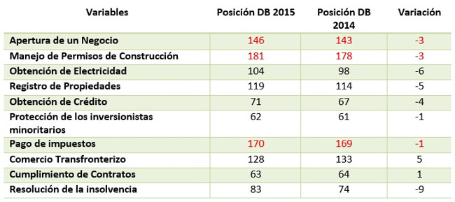Dentro de las variables analizadas, la peor performance se la atribuye en el rubro “manejo de permisos de construcción”, al ubicarse en el puesto 181, tres puestos más abajo que en la edición pasada. El segundo peor posicionamiento se lo adjudica en la variable “apertura de un negocio” con el puesto 146, según esta variable, abrir un negocio en nuestro país demanda 14 procedimientos, 25 días y tiene un costo equivalente al 15,2% del producto por individuo. Para tener una idea, en Singapur, país que lidera el ranking, abrir un negocio lleva 2,5 días, 3 procedimientos y tiene un costo que equivale al 0,6% del ingreso per cápita.