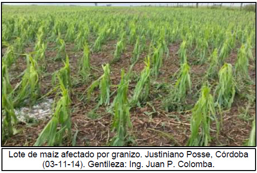 Hacia el este de la provincia de Córdoba, más específicamente en J. Posse, Monte Buey, W. Escalante, Pascanas e Inriville se registró el viernes pasado una fuerte caída de granizo, la cual trajo aparejado pérdidas parciales y totales de lotes de maíz. Por otra parte, el resto de la zona que tan sólo recibió lluvias, presenta una muy buena condición de cultivo, el cual transita estadíos de diferenciación de hojas (de V4 a V7). Por su parte, se registraron lotes donde se realizaron refertilizaciones con nitrógeno, como así también aplicaciones de insecticida en busca de controlar oruga y chinche.