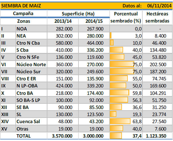 Las precipitaciones registradas durante las últimas semanas permiten recuperar la humedad disponible en el perfil para lograr un buen desarrollo del cultivo en sus primeras etapas ontogénicas. Estas lluvias a su vez, han ralentizado las labores de cobertura en el extremo sur del área agrícola nacional, en donde aún se encuentran dentro de la ventana óptima de siembra. En la zona núcleo no se han retomado las labores sobre lotes destinados a siembras tardías o de segunda ocupación, debido a que los productores se encuentran abocados a la siembra de lotes de soja.