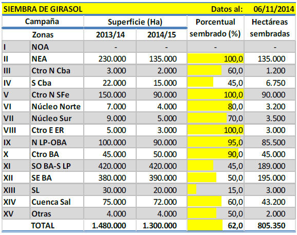 De esta manera, la reducción del área en comparación a nuestro informe previo es de 50 mil hectáreas, quedando una superficie tentativamente proyectada a nivel nacional en 1.300.000 hectáreas. Esta nueva estimación de área refleja una caída porcentual respecto de la pasada zafra del -12 % (siembra de girasol 2013/14: 1.480.000 Ha).