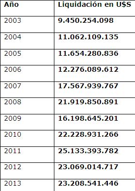 La liquidación de divisas de las empresas del sector en los últimos años fue: