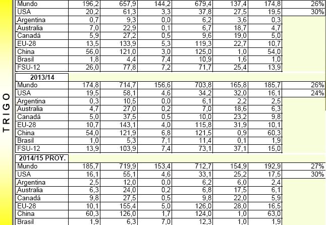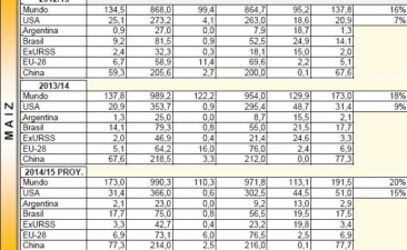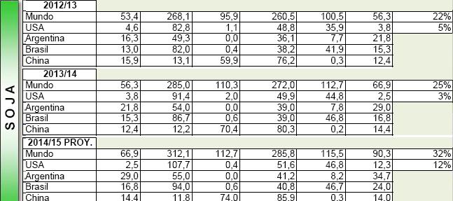 Para Sudamérica, mantiene proyección de 23 MM de tns para Argentina y 75 MM para Brasil. Sin embargo, hay una reducción en la previsión de las exportaciones del 2014/15 de Brasil en 500 mil tns a 19.5 MM de tns, y de Argentina de 14 a 13 MM de tns.
