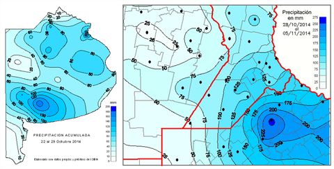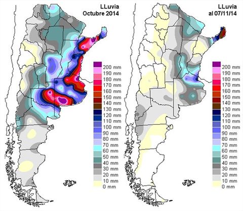 La franja oeste del país recibió lluvias oportunas en la primera semana de octubre pero luego las altas temperaturas mantuvieron condiciones desecantes que golpearon a los trigales durante el llenado en buena parte de la región pampeana. La sobreoferta de lluvias durante el fin de octubre y principios de noviembre afectó con severos excesos al sudeste santafesino, buena parte de Entre Ríos, y al noreste y sur bonaerense como se aprecia en las imágenes que elabora la consultora de climatología aplicada - CCA.