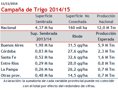 Al momento de corte de ese informe, el avance de cosecha era de un 13% sobre las 4,36 millones de hectáreas sembradas en el país. Los lotes que no entrarían a cosecha podrían sumar aproximadamente unas 160.000 hectáreas. El rinde promedio nacional es levemente superior al de la campaña pasada (27,8 qq/ha) ajustándose a 28,5 quintales por hectárea. De esta manera queda configurada una producción de 12 millones de toneladas para la campaña triguera 2014/15.