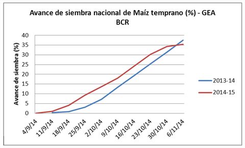 La superficie sembrada de maíz para la campaña 2014/2015 se estima en 3,67 millones de ha. Subsiste la posibilidad de ajustes posteriores en la medida que se analice la evolución de las labores de siembra de noviembre y diciembre y cómo se den las condiciones para la implantación del maíz de segunda. De esta manera la superficie nacional de maíz caería respecto al ciclo pasado en un 16,7%.
