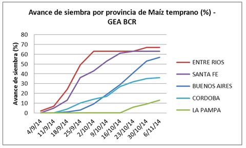 Las lluvias de octubre y los primeros días de noviembre resultaron oportunas para que los planes de rotación con el cereal se cumpliesen dentro de la ventana de siembra propicia de cada zona. El avance de siembra en la República Argentina alcanza al 40% del total intencionado. Los cuadros han quedado muy bien implantados, logrando excelentes recuentos de plantas por metro y están en muy buenas condiciones de crecimiento, algunos ya expandiendo la séptima hoja. De todas formas en la provincia de Buenos Aires hay cuadros recientemente sembrados que quedaron comprometidos por los problemas de excesos hídricos que son evaluados en estos días.