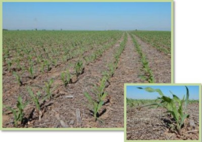 Maíz: El cultivo se encuentra en estado general muy bueno con quinta hoja desarrollada (V5) Ritchie y Hanway, 1982. Sin presencia de plagas ni enfermedades.