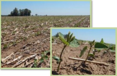 Soja: En estado vegetativo de primer nudo (V1), escala fenológica Fehr y Caviness, 1977. Estado general muy bueno. Sin presencia de plagas ni enfermedades.