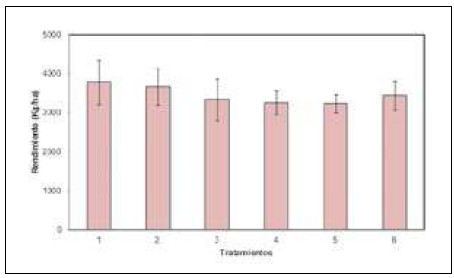 Figura 2: Rendimiento de girasol en función de los tratamientos aplicados durante la campaña 2011/12. Líneas verticales sobre las barras indican el desvío estándar.