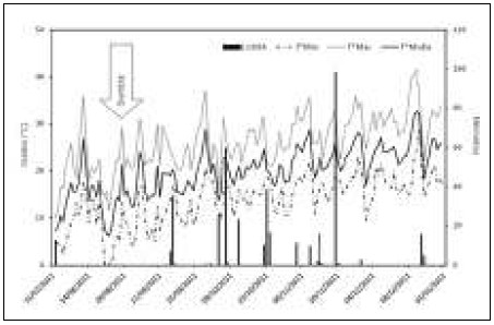 Durante los meses de agosto, septiembre y diciembre se registraron bajos niveles de precipitaciones, mientras que durante octubre y noviembre la cantidad y distribución de lluvias fue buena (Figura 1), momento en el cual el cultivo se encontraba en período crítico (botón floral y plena floración). Por otro lado, en cuanto a las condiciones térmicas de la campaña 2011/12, la temperatura media no difirió del promedio histórico de la zona y las máximas ocurrieron durante el mes de diciembre (Figura 1).