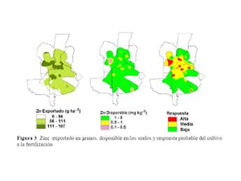 Una de estas interacciones se da con el Zinc (Zn) y el Nitrógeno (N), donde déficit de Zn en cultivos varios, pero principalmente en maíz, provoca que el Nitrógeno aportado no sea aprovechado correctamente por el cultivo. El siguiente mapa elaborado por el INTA muestra cuáles son las zonas agrícolas con déficit de Zn.