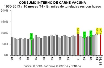 De esta forma, el consumo por habitante descendió de 63,3 kg/año en enero-octubre de 2013 a 59,2 kg/año en los primeros diez meses del corriente año, es decir que cayó 6,4% interanual.