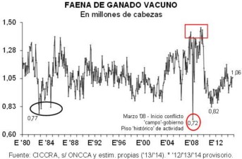 Según las estimaciones de CICCRA, en octubre la faena de hacienda vacuna fue de 1,05 millones de cabezas, repitiendo la performance observada durante septiembre. Pero la caída interanual se profundizó de 1,6% en septiembre a 9,0% en octubre, debido a que en el décimo mes de 2013 se habían faenado 1,162 millones de cabezas, un récord para el año. De este modo, la industria frigorífica mostró la octava caída de su nivel de actividad en diez meses.