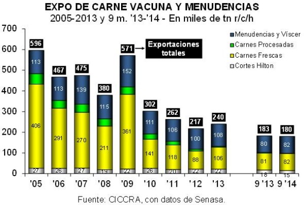 En los primeros diez meses de 2014 la industria frigorífica argentina produjo un total de 2,235 millones de tn r/c/h de carne vacuna. En términos interanuales, este volumen resultó inferior en 130,6 mil toneladas (-5,5%).