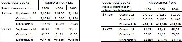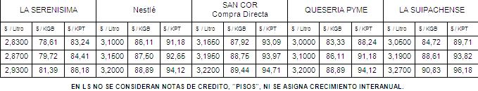 En la Cuenca Oeste de Bs. As., para una leche libre de Brucelosis y Tuberculosis, con 3.60% grasa y 3.40% proteína, que tiene 25.000 UFC, 300.000 CCS, y es remitida a 4.0 ºC. Se trata de una estimación genérica y -como tal- sólo orientativa, referida a algunas de las principales empresas que operan comercialmente en la Región. IMPORTANTE: Se trata de valores estándar “de circular” en “anillo 2” para La Serenísima (no incluye notas de crédito), pero de precios “llenos” para el resto de las empresas. La 1º fila, se refiere a un tambo de 1400 litros / día, la 2° corresponde a un tambo de 4000 litros / día, y la 3º hace referencia a un tambo de 8000 litros / día.
