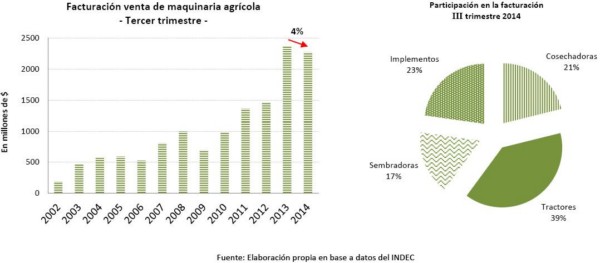 De acuerdo a los datos publicados por el INDEC, la venta de maquinaria agrícola en el tercer trimestre de 2014 fue de $ 2.271,9 millones, lo que representa una caída de 4% respecto a igual período del año anterior y de un 13% respecto al segundo trimestre del 2014. El 39% del monto facturado correspondió a la venta de tractores, el 21% a cosechadoras, el 23% a implementos y el 17% a sembradoras.