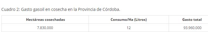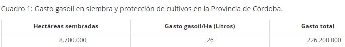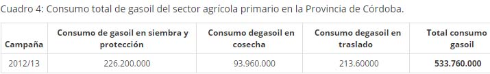 De la sumatoria de los tres rubros resulta que en la Provincia de Córdoba el consumo de gasoil en el sector agrícola es de aproximadamente 213 millones de litros. Con este análisis por rubro, calculamos (Cuadro 4) el total de consumo de Gasoil en la Provincia de Córdoba del sector agrícola.