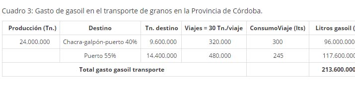 Transporte de Granos: Al gasto de combustible lo clasifico según el destino de los granos: 60% traslado a puerto; 40% chacra – galpón + puerto posteriormente. Según la producción de granos de la Provincia, con una carga de 30 Tn. por viaje, teniendo en cuenta el destino y el consumo de gasoil en cada viaje, obtendré el consumo por el transporte de granos.
